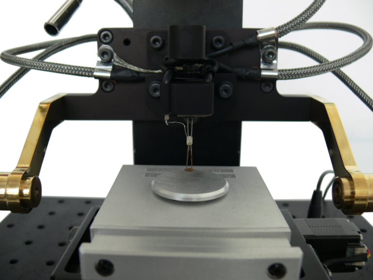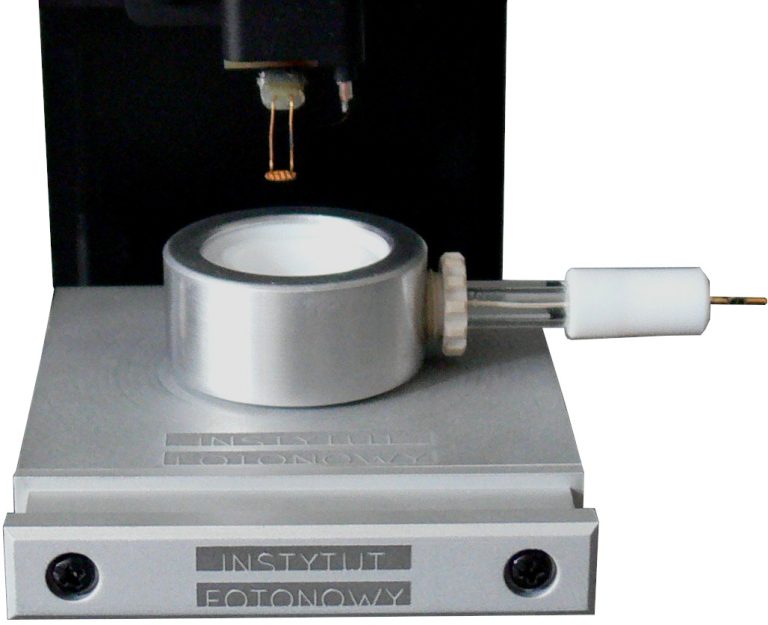 The most important part of the Kelvin Probe instrument is the Probe Tip. The probe is fully designed and manufactured by Instytut Fotonowy. The reference electrode is made of Au mesh of 2.5 mm diameter. It provides high signal to noise ratio, even from a distance of 0.5 mm above the sample. Thus, it does not matter if the examined sample surface is rough or polished. The tip oscillations are generated with an electromagnet.